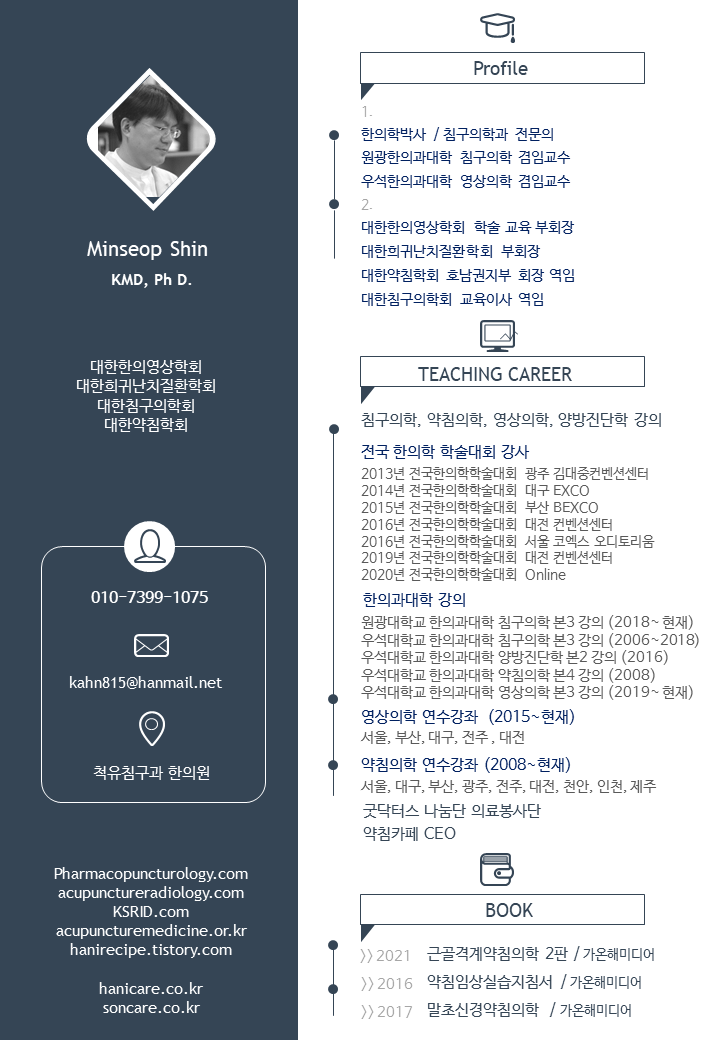 원광한의과대학 침구의학 겸임교수 │ 우석한의과대학 영상의학 겸임교수 │ 한의학박사