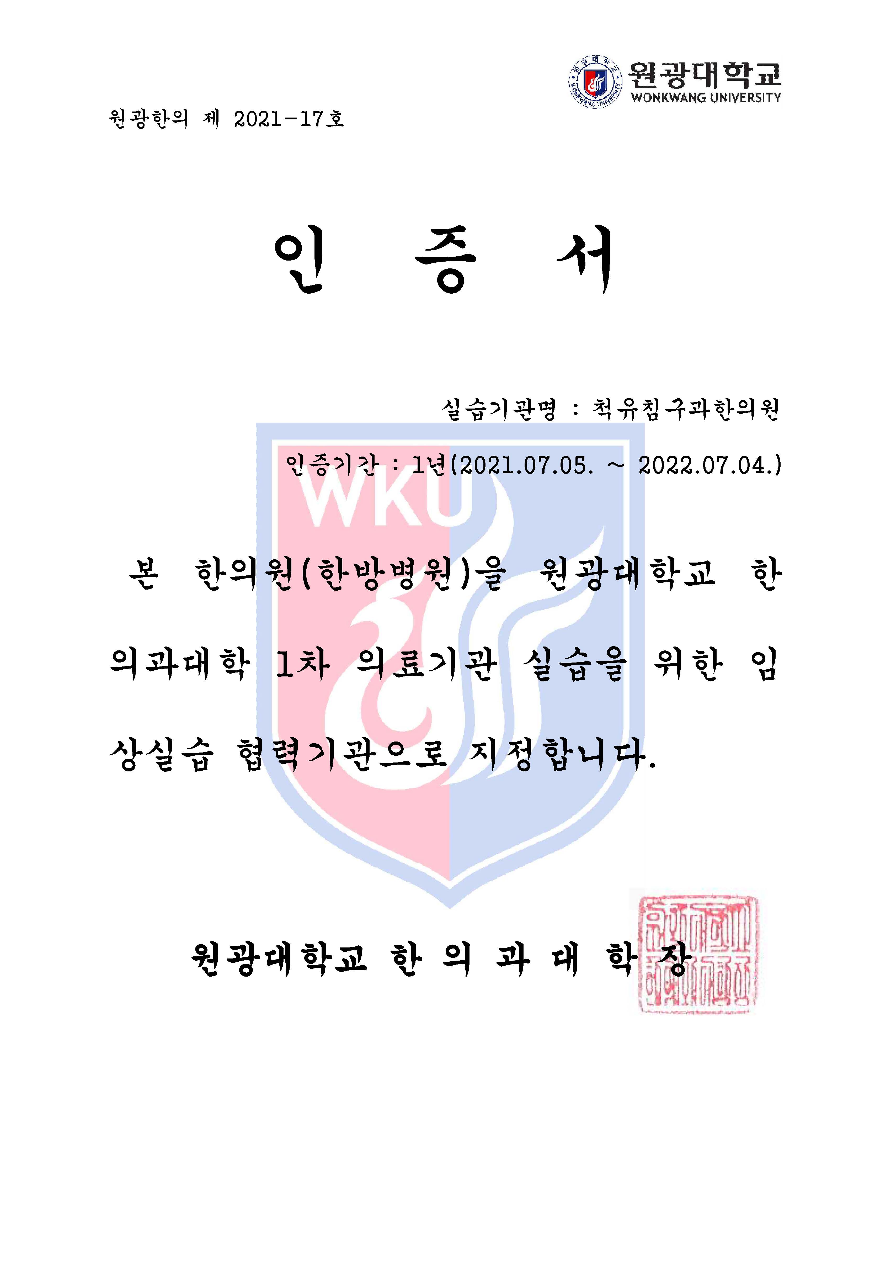 원광대학교 한의과대학 1차 의료기관 실습 지정